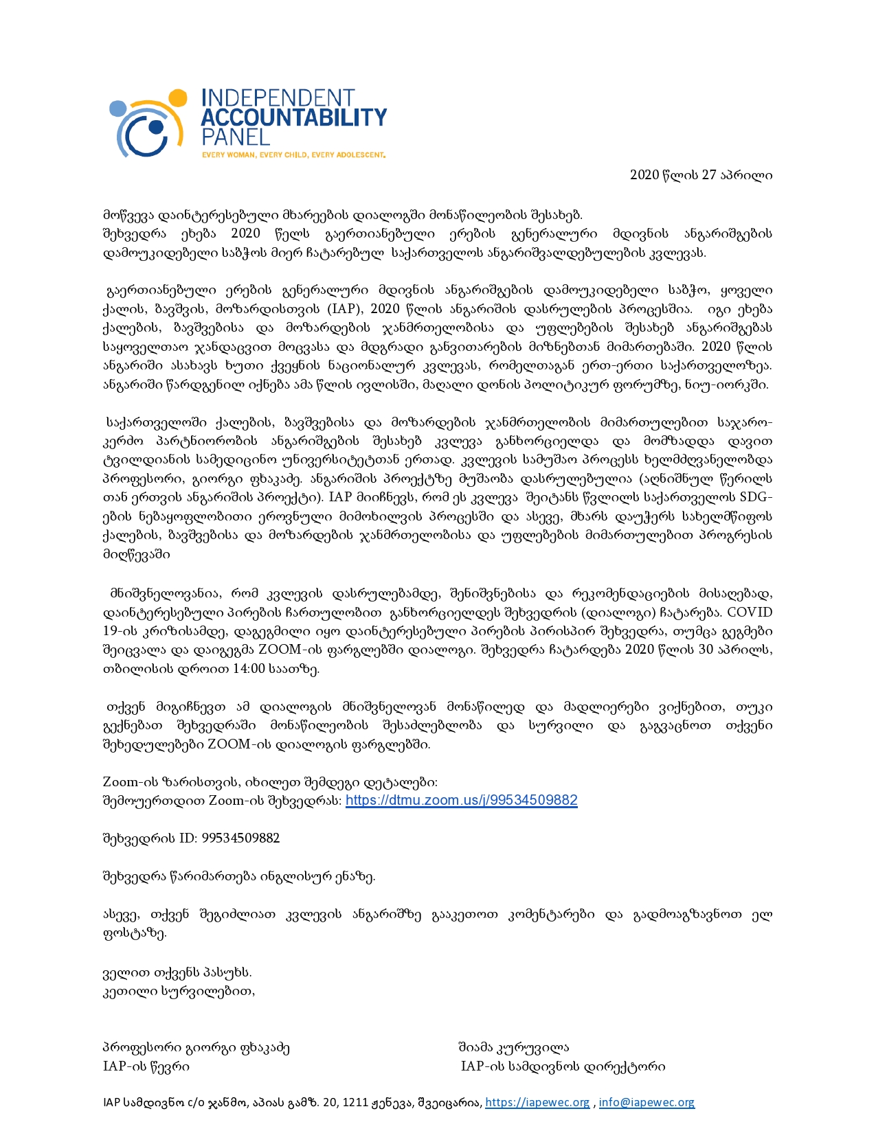 თქვენ მიგიჩნევთ ამ დიალოგის მნიშვნელოვან მონაწილედ და მადლიერები ვიქნებით, თუკი გექნებათ შეხვედრაში მონაწილეობის შესაძლებლობა და სურვილი და გაგვაცნოთ თქვენი შეხედულებები ZOOM-ის დიალოგის ფარგლებში.