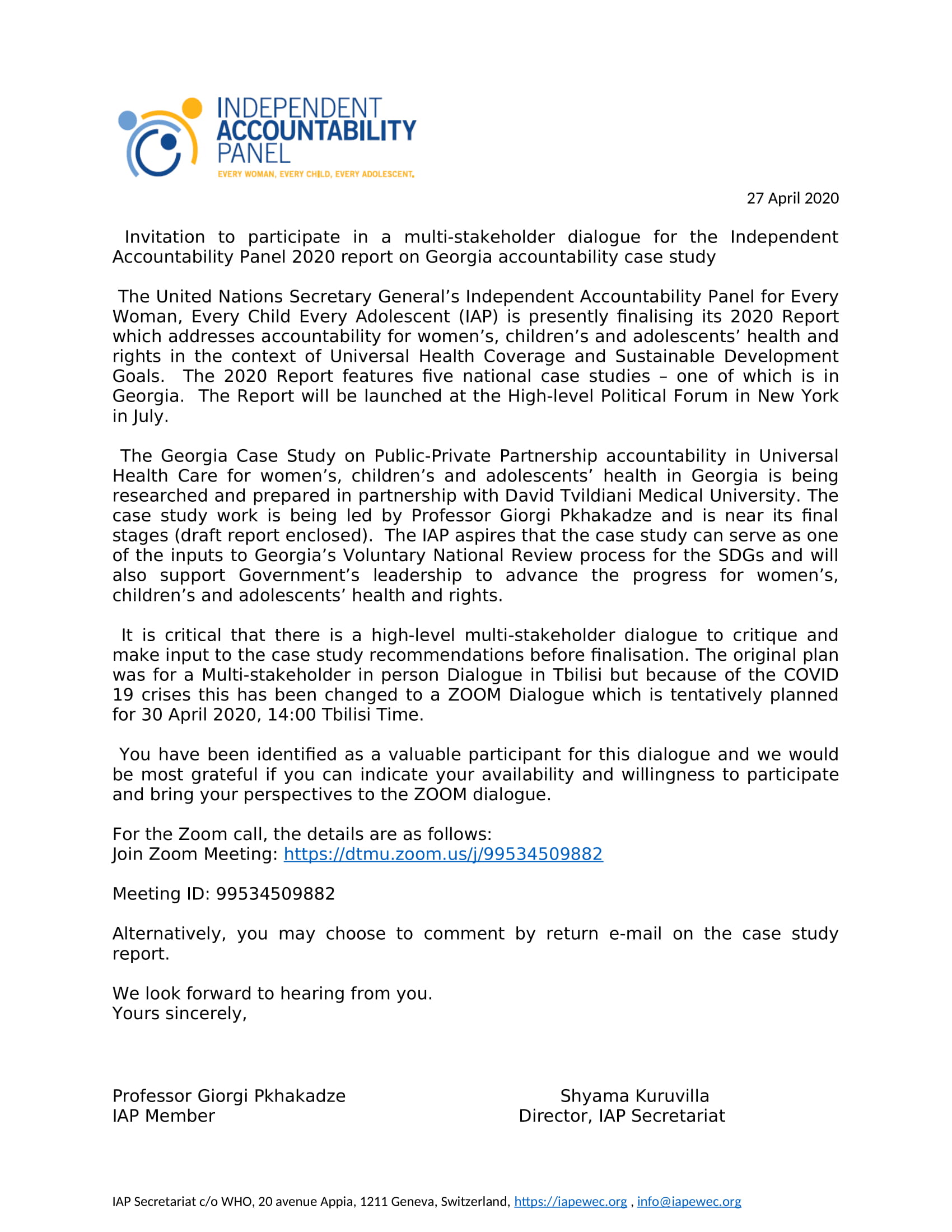გაერთიანებული ერების გენერალური მდივნის ანგარიშგების დამოუკიდებელი საბჭო, ყოველი ქალის, ბავშვის, მოზარდისთვის (IAP), 2020 წლის ანგარიშის დასრულების პროცესშია. იგი ეხება ქალების, ბავშვებისა და მოზარდების ჯანმრთელობისა და უფლებების შესახებ ანგარიშგებას საყოველთაო ჯანდაცვით მოცვასა და მდგრადი განვითარების მიზნებთან მიმართებაში. 2020 წლის ანგარიში ასახავს ხუთი ქვეყნის ნაციონალურ კვლევას, რომელთაგან ერთ-ერთი საქართველოზეა. ანგარიში წარდგენილ იქნება ამა წლის ივლისში, მაღალი დონის პოლიტიკურ ფორუმზე, ნიუ-იორკში.