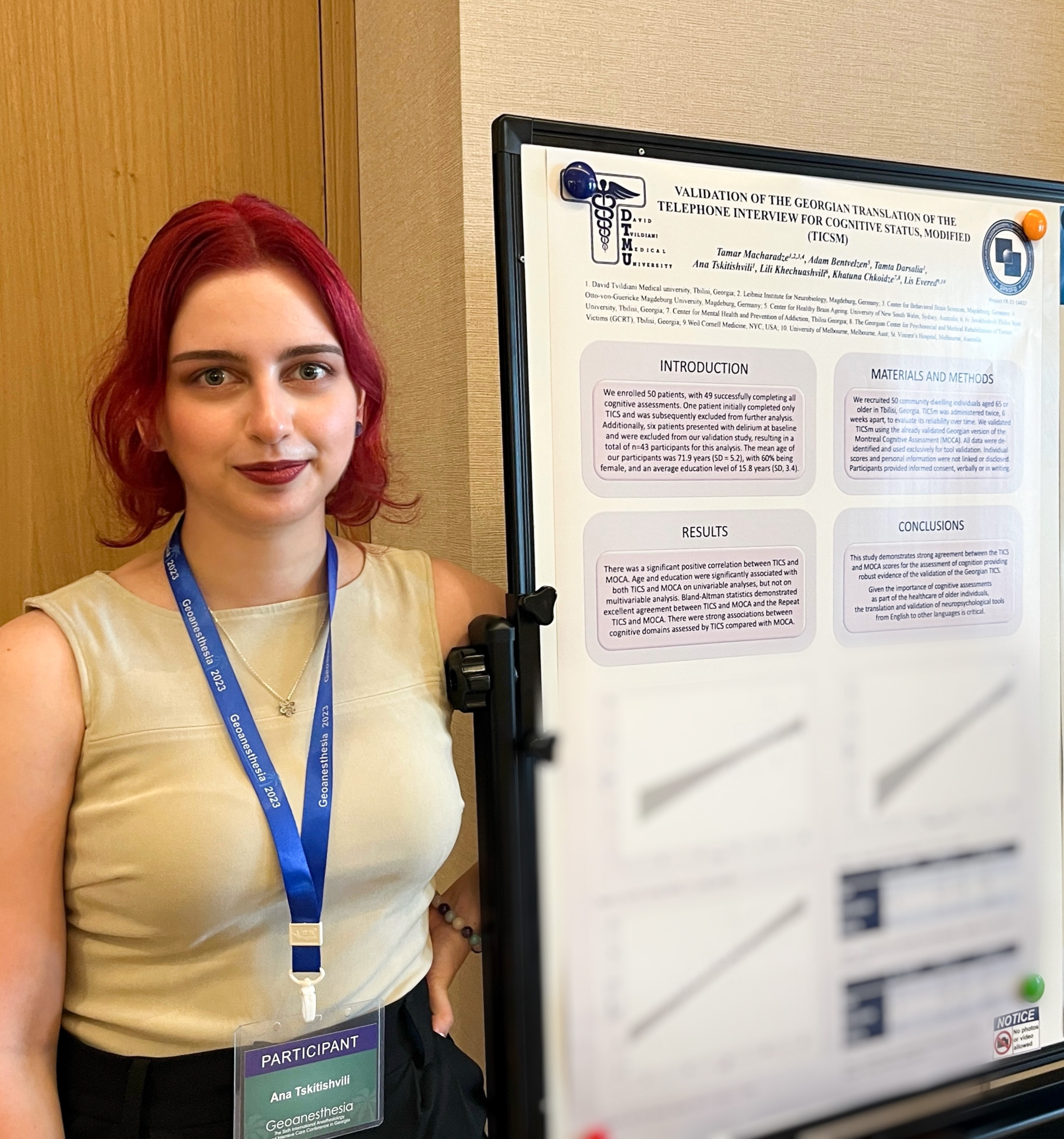 დავით ტვილდიანის სამედიცინო უნივერსიტეტში მიმდინარე სამეცნიერო ფართომასშტაბიანი კვლევის ხელმძღვანელმა, ასოცირებულმა პროფესორმა, თამარ მაჭარაძემ, ამა წლის 22-23 სექტემბერს, ქ.ბათუმში, მისსავე თანაორგანიზატორობით მოწყობილ ანესთეზიოლოგ-რეანიმატოლოგთა ყოველწლიურ კონფერენციაზე „Geoanesthesia 2023“ გააკეთა მოხსენება „ნეიროფსიქოლოგიური ტესტები ქართულ პოპულაციაში“. ამავე შეხვედრაზე აღნიშნული პროექტის ფარგლებში, თამარის ხელმძღვანელობით, პოსტერული მოხსენებით წარდგა დავით ტვილდიანის სამედიცინო უნივერსიტეტის კურსდამთავრებული, ანი ცქიტიშვილი: თ.მაჭარაძე, ა. ბენტველცენი, თ. დარსალია, ა. ცქიტიშვილი, ლ. ხეჩუაშვილი, ხ.ჭყოიძე, ლ.ევერდი; „კოგნიტიური სტატუსის შეფასების სატელეფონო ტესტის ვალიდაცია ქართულ ენაზე“.